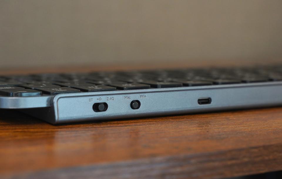 Keychron B1 ProはBluetooth(3台切り替え)、2.4Ghz(ドングル付き)、USB有線での3接続方式に対応しており、WindowsとMacのキーレイアウトもスイッチで切り替えできます。接続性の良さはMX Keys miniに負けていません。
