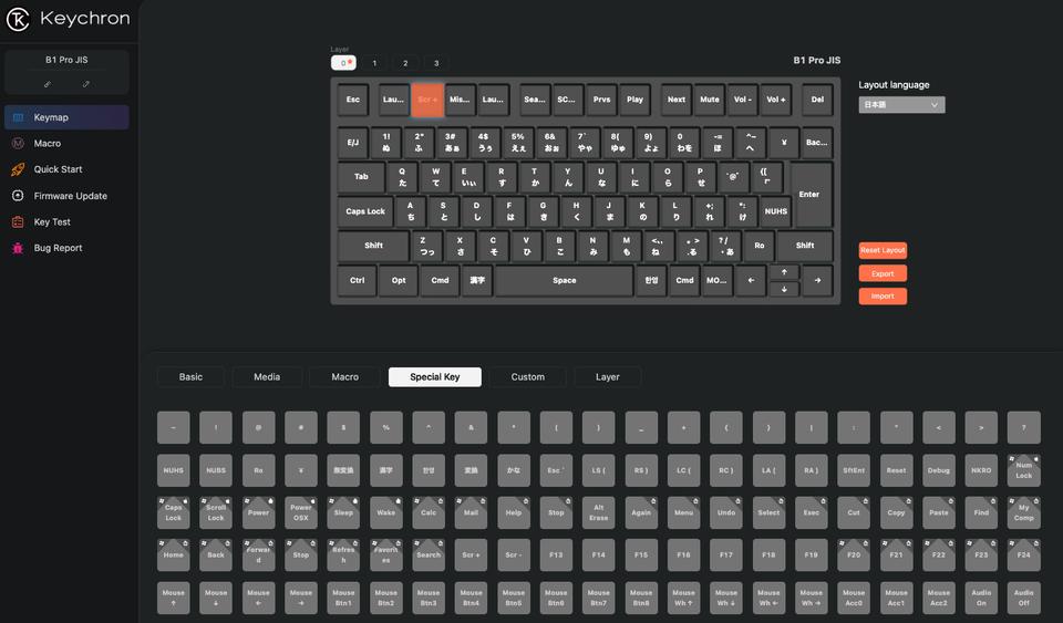 嬉しかったのが、オンボードメモリによるキーリマップやマクロに対応している点。ブラウザから設定ページを開いて簡単にキー割当を変更できる手軽さは、MX Keys miniにはないメリットですね。