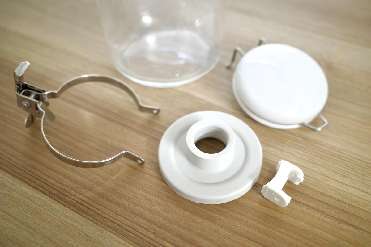 フタ、フタ止め、パッキン注ぎ口はそれぞれ100℃以上の耐熱仕様だったので、容器と一緒に煮沸しちゃいます。保存瓶は清潔さ命ですから、すみずみまでしっかり洗えると食材の持ちもよくなりそうですね。
