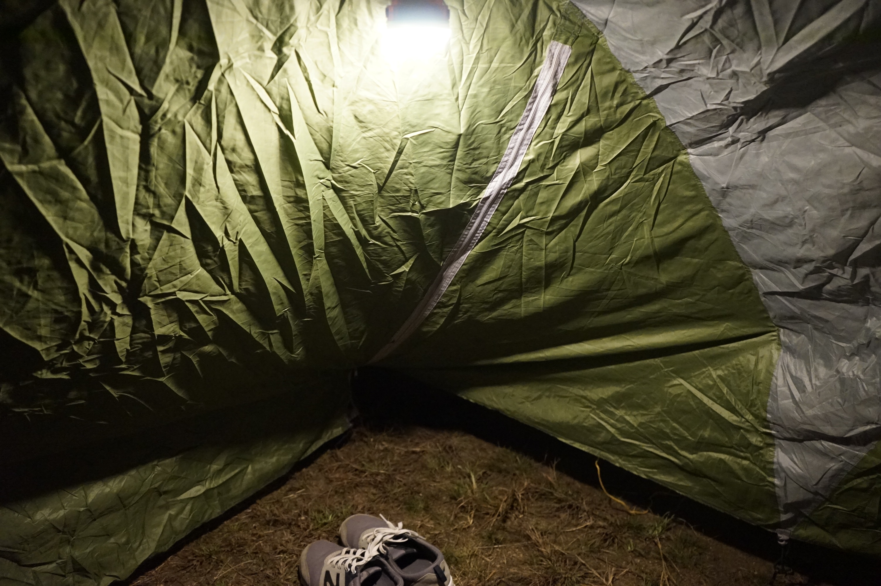テント前室に引っ掛けるところがなかったので、ポールにくっつけて使用してみたら、とても明るくて靴の脱ぎ履きも楽にできました。