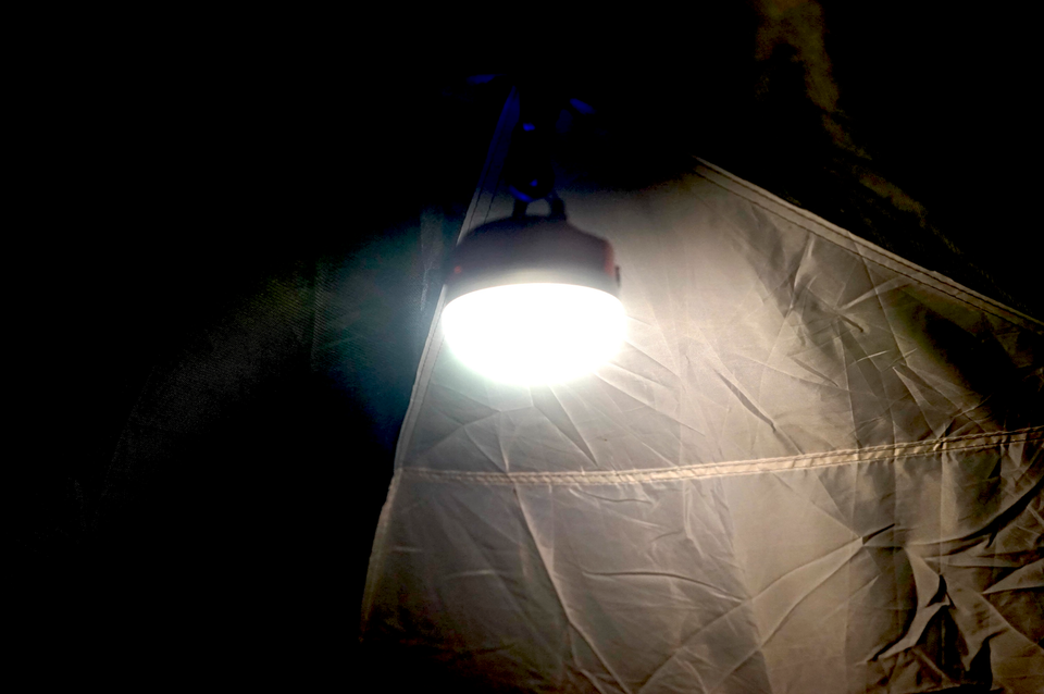 カラビナ付きなので、ランタン用のS字フックがなくても吊り下げることが可能。250ルーメンのHighにするとテント全体が十分な明るさになりました。