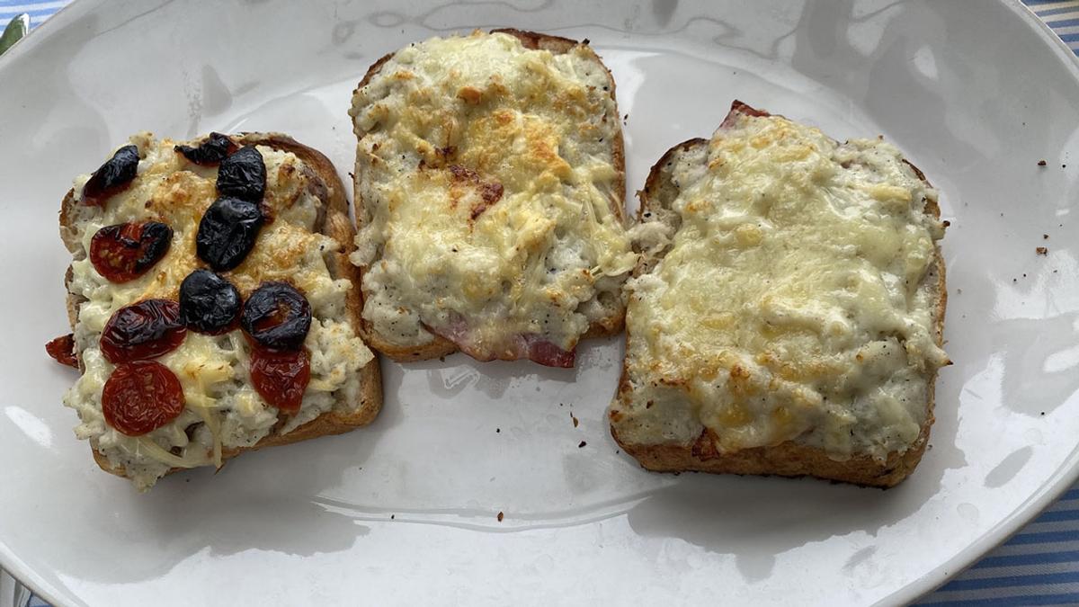 パン・ド・ミーで作ったクロックムッシュ。焼いた豚肉とドライトマトを載せたものは美味しくありませんでした。