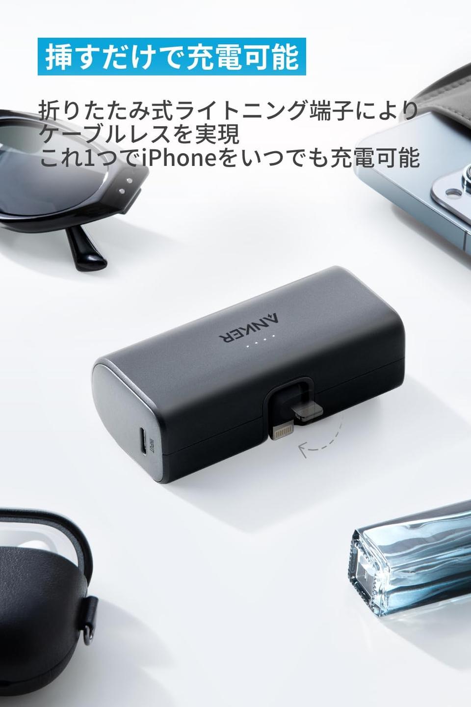 「Anker Nano Power Bank」は、充電端子一体型のモバイルバッテリー。本モデルは本体に折りたたみ式のLightning端子がついているので、充電ケーブルなしでもiPhoneを充電してくれます。