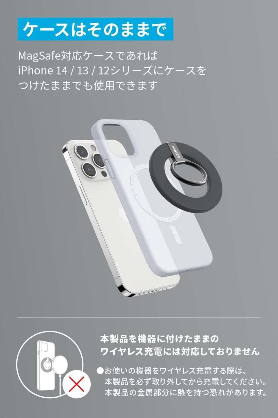 また、本商品はMagSafe対応ケースであれば、ケースをつけたままでも使用が可能な点も見逃せないポイント。スマホリングとケースのセットで、愛用のiPhoneに傷をつけるリスクを相当減らせそうです。
