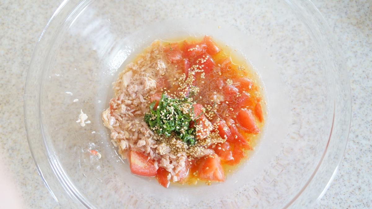 2. ボウルに手順1の冷凍トマトと大葉、軽く汁気を切ったツナ缶、めんつゆ、水、ごま油、白ごまをボウルに加えて混ぜ、器に盛り付けてできあがり。