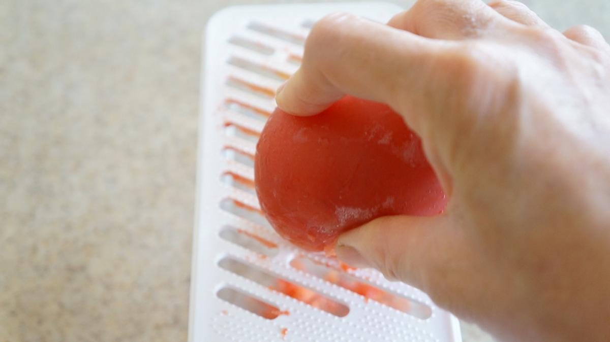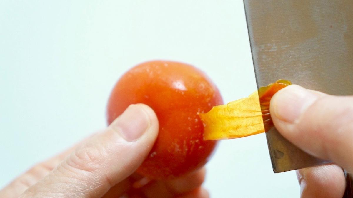 冷凍トマトは保存に便利なだけでなく、凍ったまま料理に使えるので、冷凍庫にストックしておくのがオススメ。