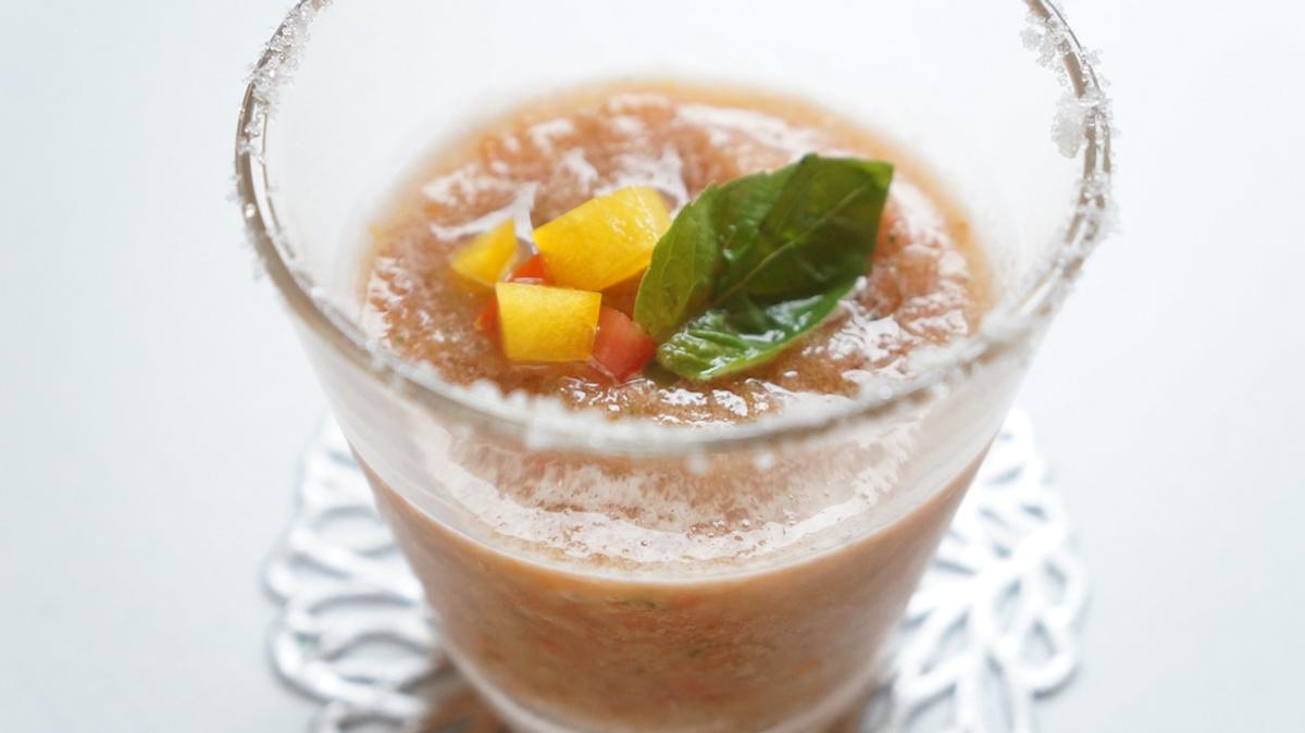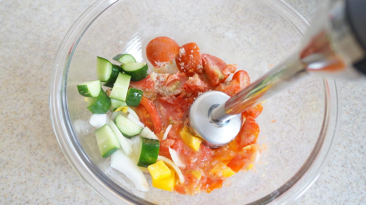 野菜たっぷりの「ガスパチョ」は夏バテ中にオススメのメニュー。冷凍トマトを使えば冷やす手間も省け、シャリシャリとしたシャーベットのような食感に仕上がります。