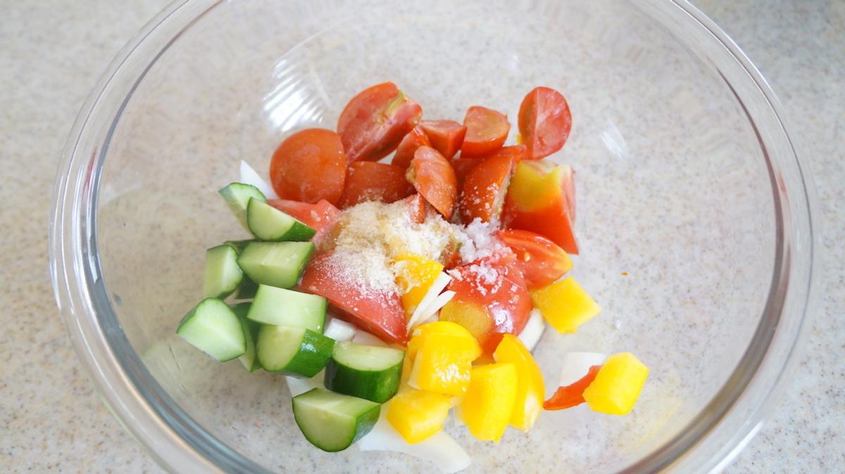 1. 冷凍トマトと野菜はざく切りにし、材料を全てボウルに入れる。