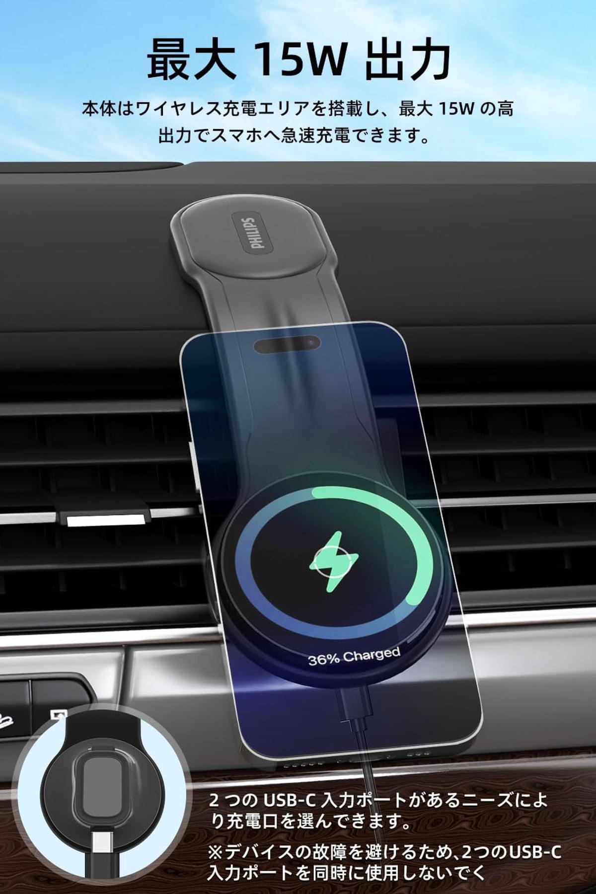 本日2025年7月29日は、最大15W出力でスマホを充電しながら使えるPhilips(フィリップス)の「車載スマホホルダー(DLK2301Q)」がお得に登場しています。