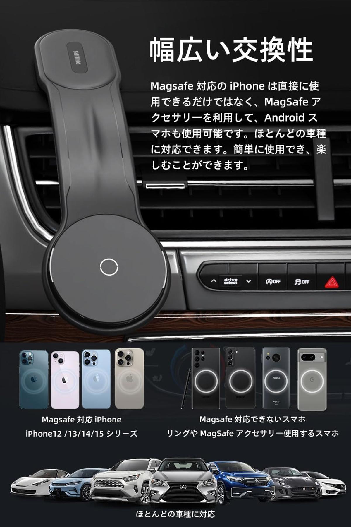 MagSafe対応でiPhoneを近づけるだけでピタッと固定。操作もしやすく、運転中のストレスを軽減してくれますよ。