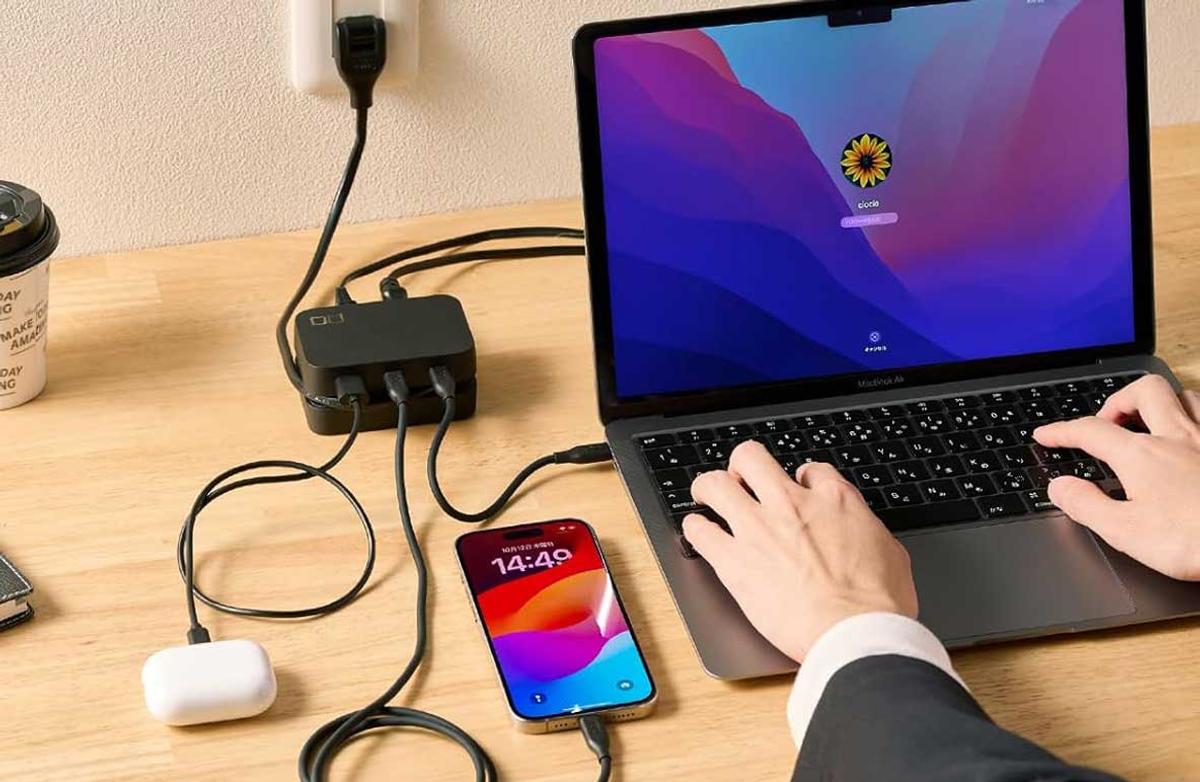 ACコンセント×2・USB-Type Cポート×2・USB-Type Aポート×1を搭載してるので、電源コンセントが1つあれば5つの機器に同時充電(給電)できるんです。