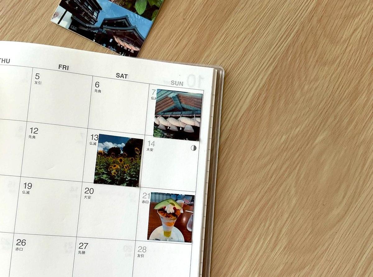 また最近SNS上で見かけて知ったのが、分割にしてマンスリーページのマス目に貼る「フォトログ」方式。