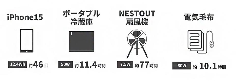 ちなみに連続使用の目安時間は、LEDライトなら約41.5時間、50Wのポータブル冷蔵庫なら約11.4時間とのこと。また、夏に必須の扇風機は約14.2時間、防寒対策の電気毛布は約10.1時間連続で使用可能。