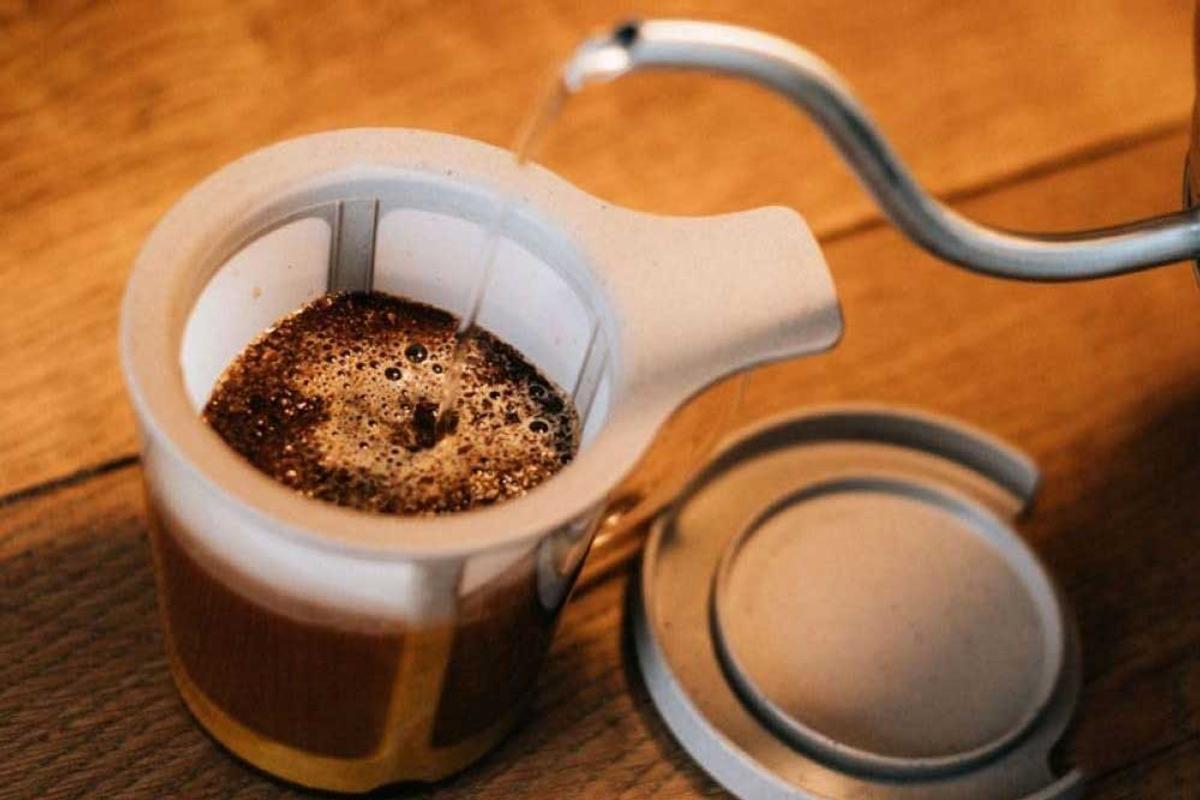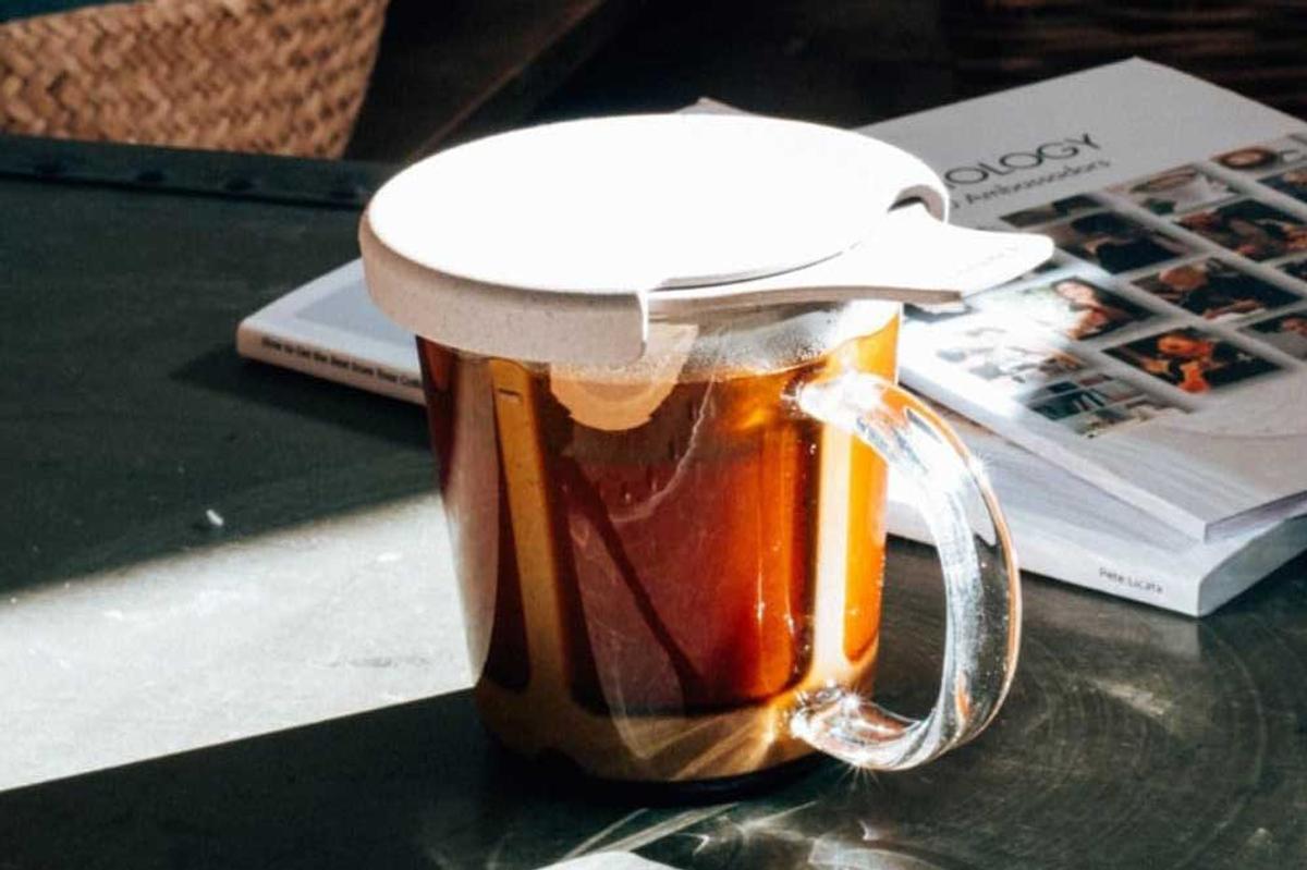ストレーナーをグラスの上にセットして、コーヒー粉を入れます。コーヒー粉の上からお湯を注いでフタをしたら、3分ほど待って出来上がり!