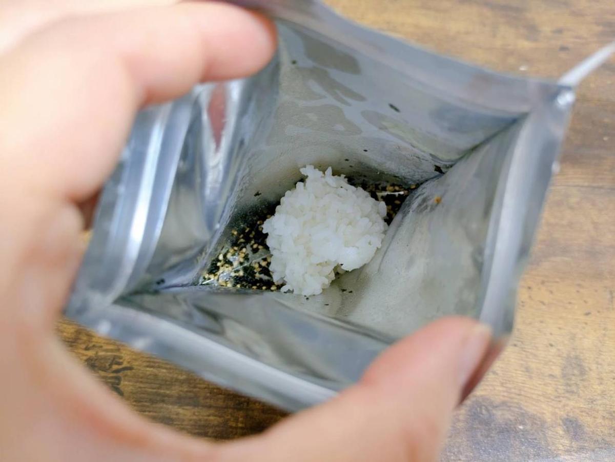 ザクザクわかめの残りが少なくなったら、袋に直接白ごはんを投入! チャックを閉めてフリフリすると、袋の底に張り付いているわかめやごまを余すことなく使って混ぜごはんができます。
