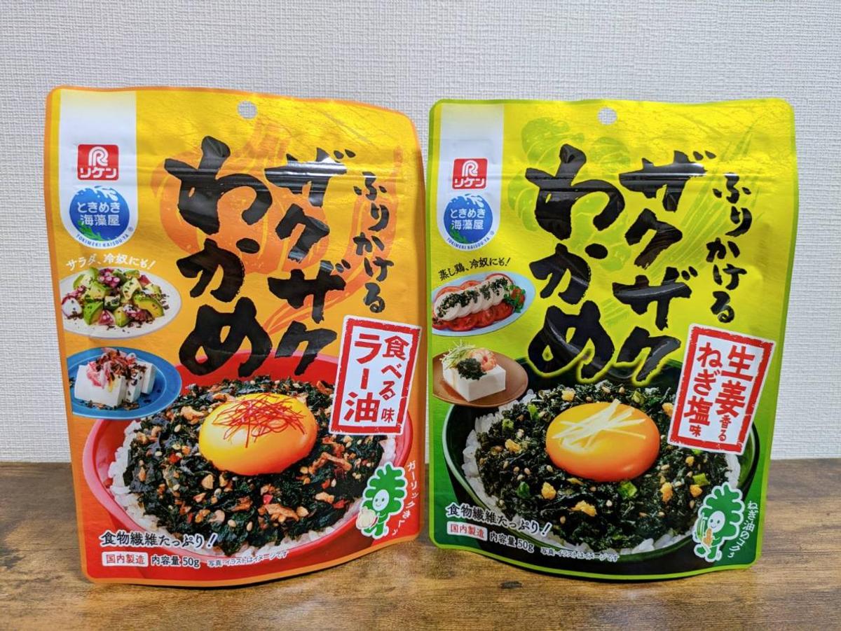 ザクザクわかめは、ほかに「食べるラー油味」と「生姜香るねぎ塩味」もあります。食べるラー油味は、わかめに加えてフライドガーリックのカリカリ食感も楽しい! まずは水餃子とか、ふだんラー油をかけている料理に使ってみるのがオススメです。生姜香るねぎ塩味は、開封した瞬間香る生姜の香りが幸せ! ふだん生姜がのっている料理をイメージしてみてください。私は、蒸し鶏や蒸しなすにのせています。