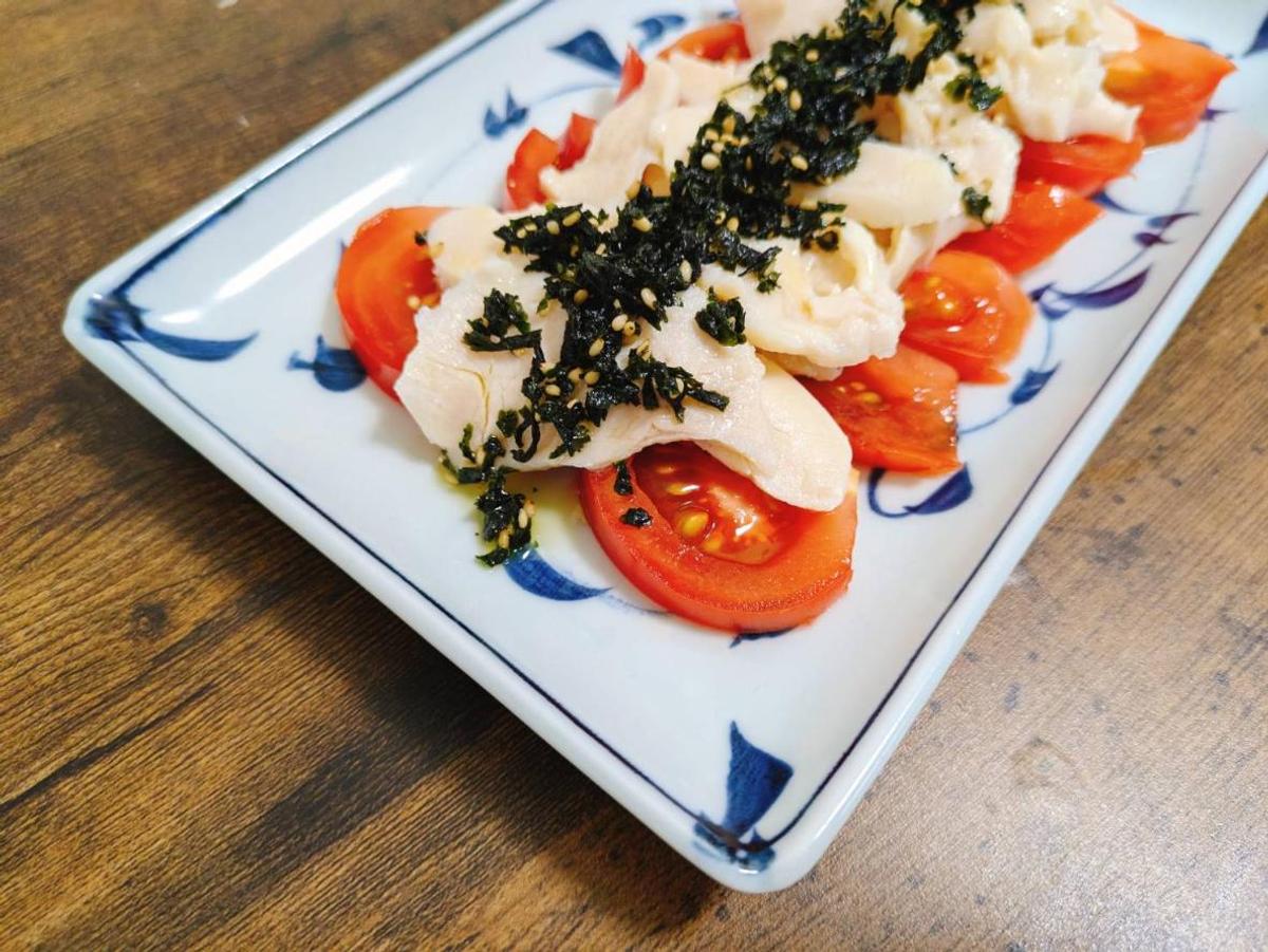 ふりかけるザクザクわかめの公式サイトに載っているレシピを見ながらつくってみた中で、我が家のお気に入りは蒸し鶏! 半月切りにしたトマトの上に市販のサラダチキンをのせ、ザクザクわかめをふりかけるだけ。食感が楽しいタレって感じです。
