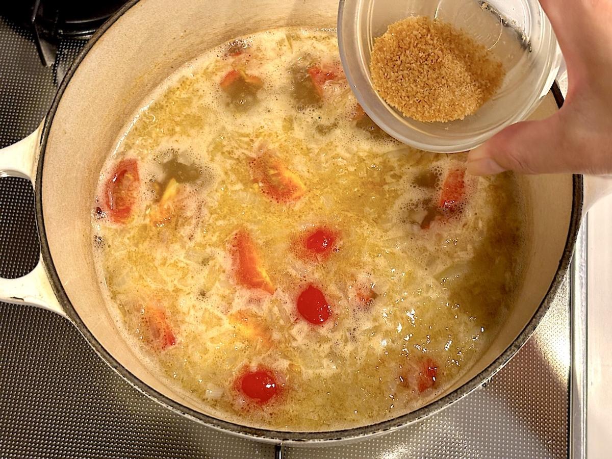 4. 3に水を入れ煮たたせ、コンソメを混ぜ溶かす。