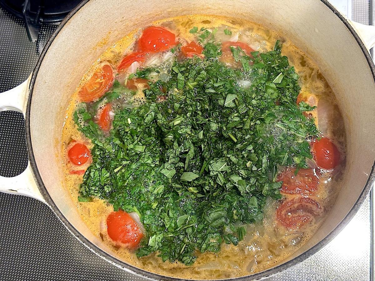 モロヘイヤは長く火を通すと黒ずんでくるので、スープに加えたらさっと煮立たせて火を止めるときれいなグリーンのスープになりますよ。