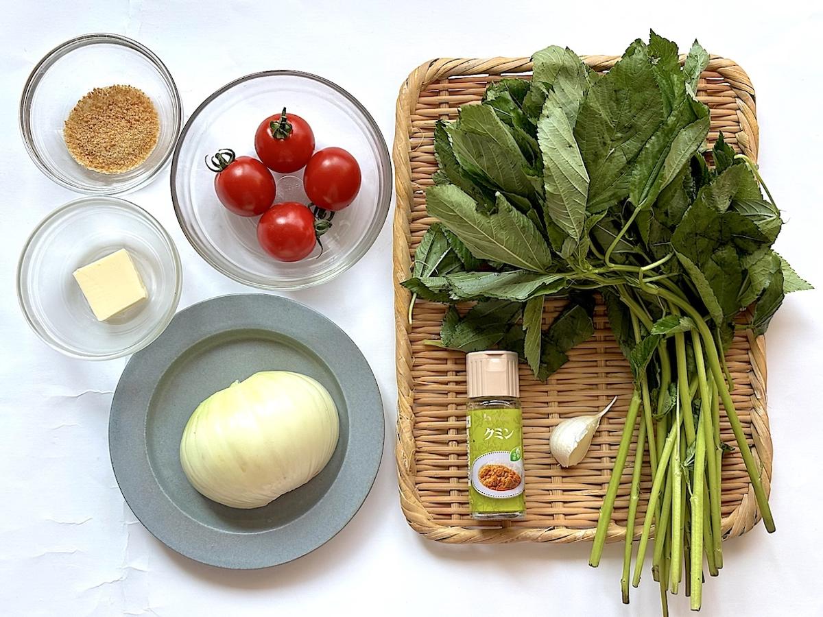 1. にんにくと玉ねぎはみじん切り、トマトは4等分に。モロヘイヤの茎は硬いので使わず、葉だけ摘み取って粗みじん切りにする。