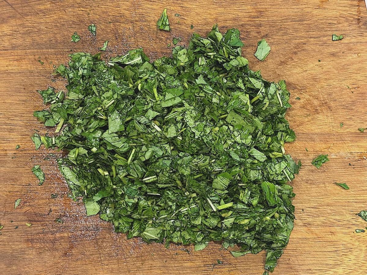 5. 刻んだモロヘイヤを加えてさっと火を通し、塩で調味してできあがり。