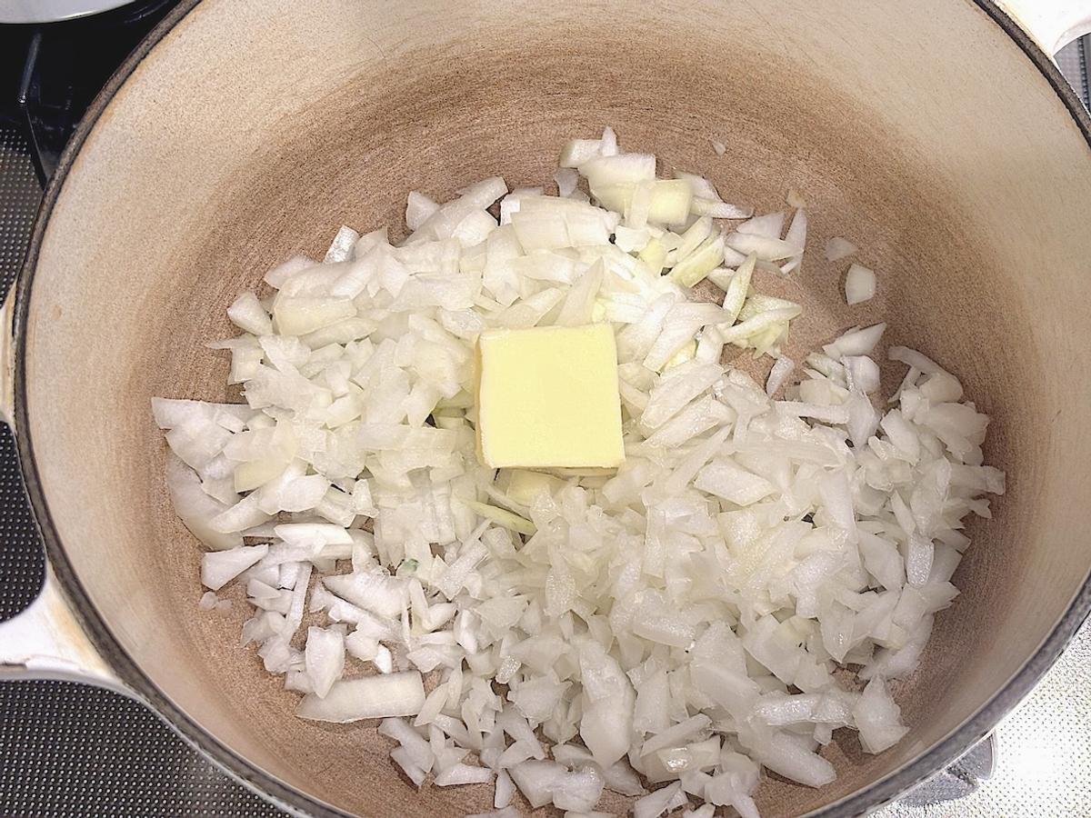 2. 鍋にオリーブオイルとバターを入れ、にんにくと玉ねぎを加えて焦がさないように炒める。