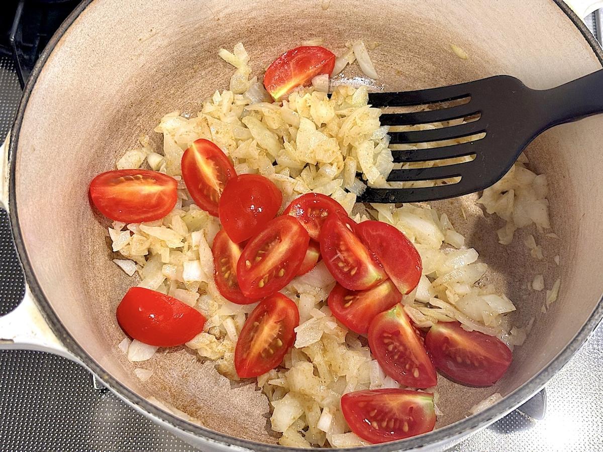 3. あればクミンパウダーを振り入れて、トマトを加える。