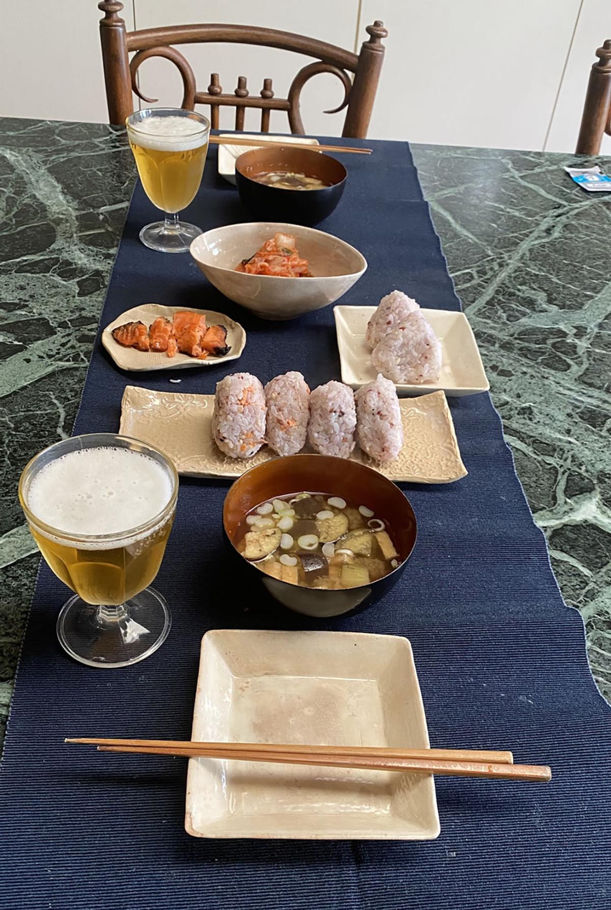 ものすごく疲れていてだるい。考えられるのは「夏バテ」しかない。とはいえ、お腹は空いている。ご飯を炊いて、鮭おにぎりと梅干しおにぎり、白菜キムチ、味噌汁(茄子と油揚げ)。お味噌汁の美味しさが身にしみた。