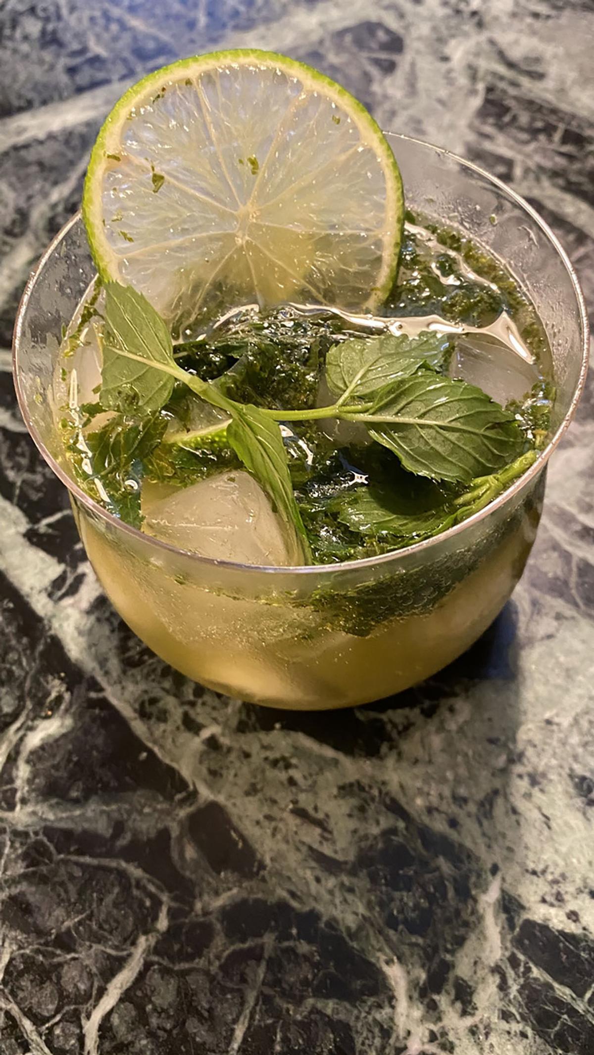 どっさり入ったミントのモヒート。日が暮れると海風が吹いてきて、とても涼しくなる。