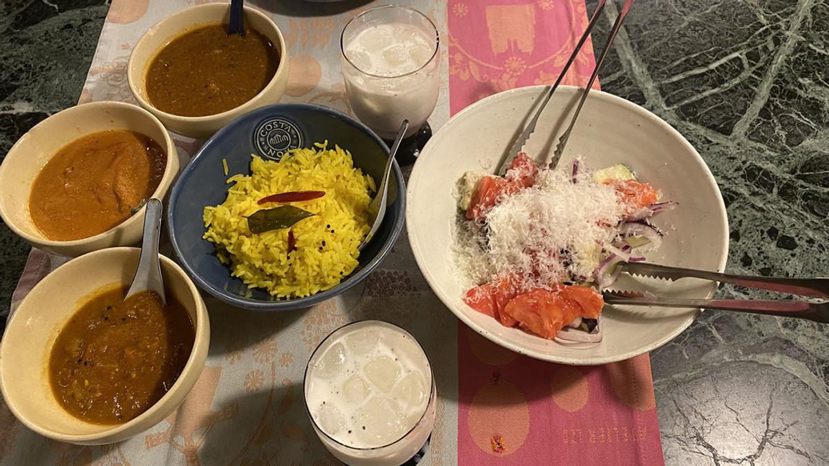 やる気がでない! 今夜もErick Southにお願いしよう、と冷凍室を見たら、2種類のミックスカレーがあった。ああ、残ったカレーを混ぜ合わせたのだった。2種類のミックスカレーとチキン蜂蜜カレーとレモンライス。サラダ(紫たまねぎ、水ナス、トマト、パルミジャーノ)、ラッシー。ヨーグルトと牛乳と水、ちょっとお塩。これらを混ぜたラッシー、とても美味しい。本場味のカレーとよく似合う。