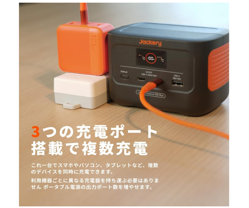 USB-C×2 + USB-A×1の3ポートを搭載し、USB-C単ポートで最大100W、3ポート同時使用でも最大102Wの出力が可能です。