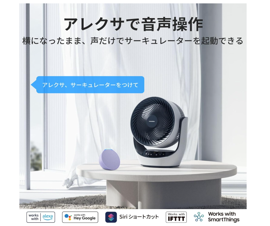 Alexa・Google Home・Siriで音声操作も可能です。SwitchBotシリーズ連携で温湿度に応じた自動制御もできます。