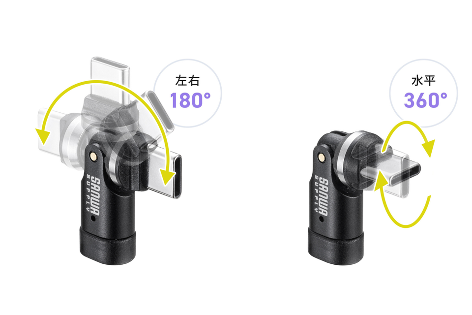 「AD-USB34CCFBK」の一番のポイントは、いつものケーブルのコネクタ部分を左右180度、水平360度に回転させることができるということ。
