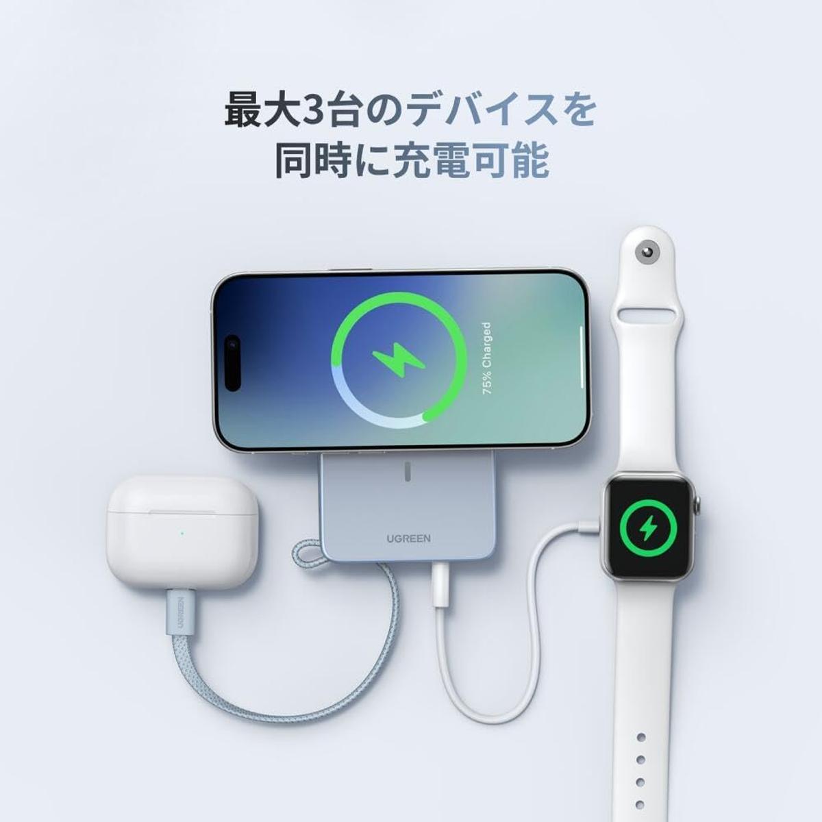 その内蔵ケーブルにワイヤレスとUSB-Cポートを加えると、写真のようにスマートフォン・イヤホン・スマートウォッチなど3台同時に充電も可能ですよ。