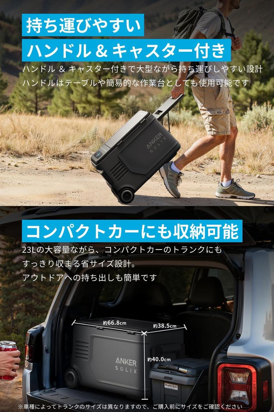 そこで今回は、約52時間の保冷力とモバイル電源機能を備え、ハンドル&キャスター付きで持ち運びも楽々できる、Anker(アンカー)のポータブル冷蔵庫「Solix EverFrost 2 23L Electric Cooler」をご紹介します。