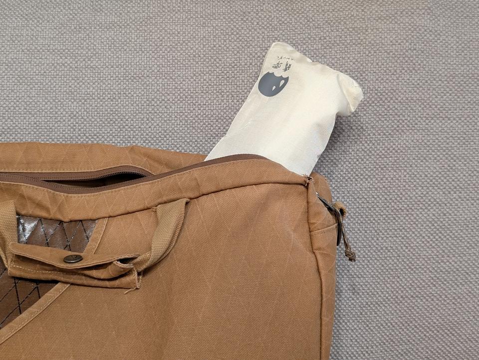 まだ雨傘としての出番はやってきていないのですが、フルオープン設計の傘袋は、内面がマイクロファイバー、外面は撥水生地になっているので、使った傘を濡れたまま袋に突っ込んで、そのままカバンに入れても問題なしとのこと。