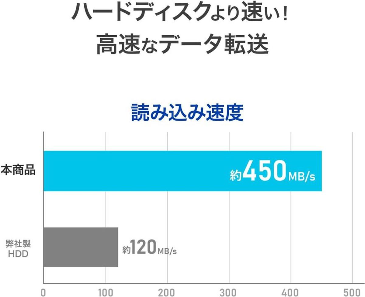 小型でも読み込み速度はバッチリ。最大約450MB/s、書き込み速度は最大約400MB/sと高速転送が可能です。