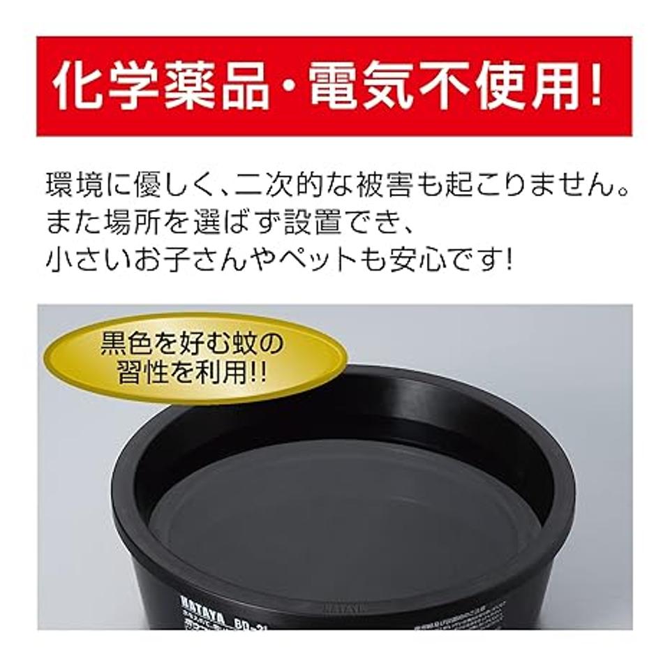 この製品の最大の特徴は、薬剤・電気不使用なのに効果的に蚊を駆除できること。黒い鋼製の専用缶に水を入れて置いておくだけ!黒色を好む蚊の習性を利用して、蚊に産卵させ、幼虫(ボウフラ)をまとめて駆除します。