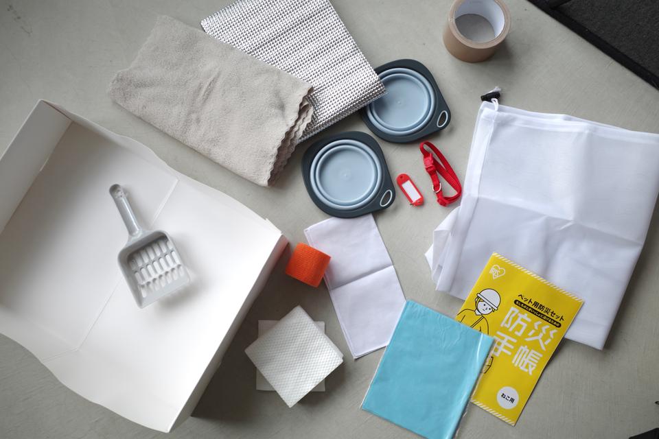 気になる中身は、ディッシュ2枚、アルミシート、折りたたみトイレ、スコップ、防臭袋20枚、迷子札や首輪、猫ネットをはじめとした食事・排泄・衛生周りをケアする15品。