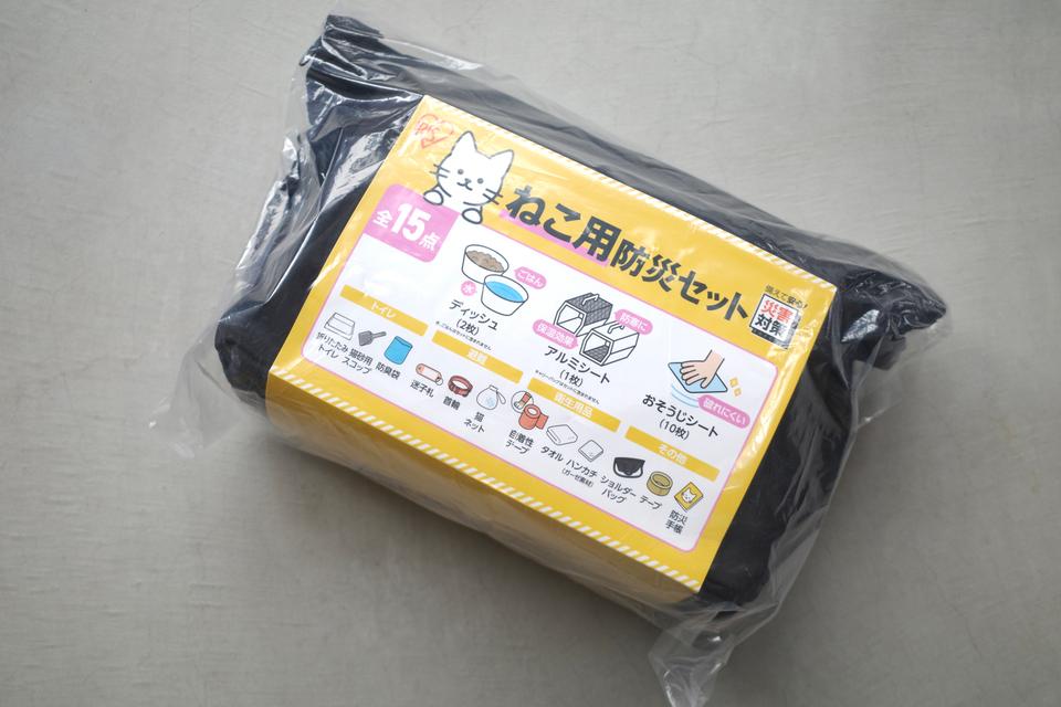 そんな折、アイリスオーヤマの「猫用・ペット用防災セット 15点セット PBSN-15」が雑誌で紹介されているのを見かけまして。