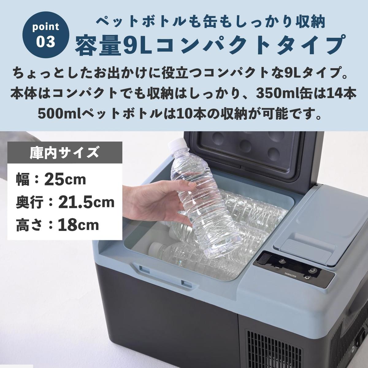 9Lサイズは500mlペットボトルが10本、350ml缶が14本も収納でき、家族や友人とのちょっとしたお出かけにぴったりの大きさです。