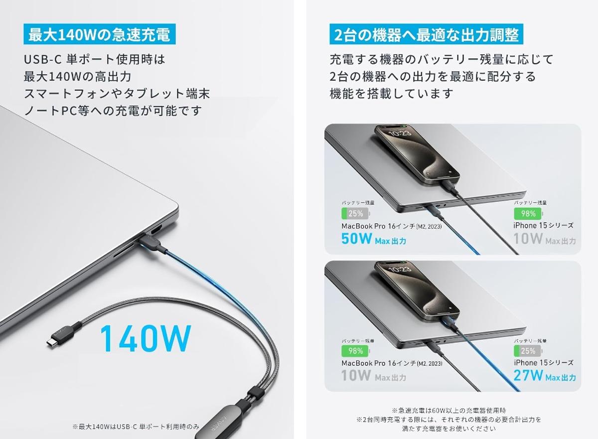 さらにUSB-C単ポート使用時は最大140Wの高出力で、スマートフォンやタブレット端末のみならずノートPCの急速充電も可能。