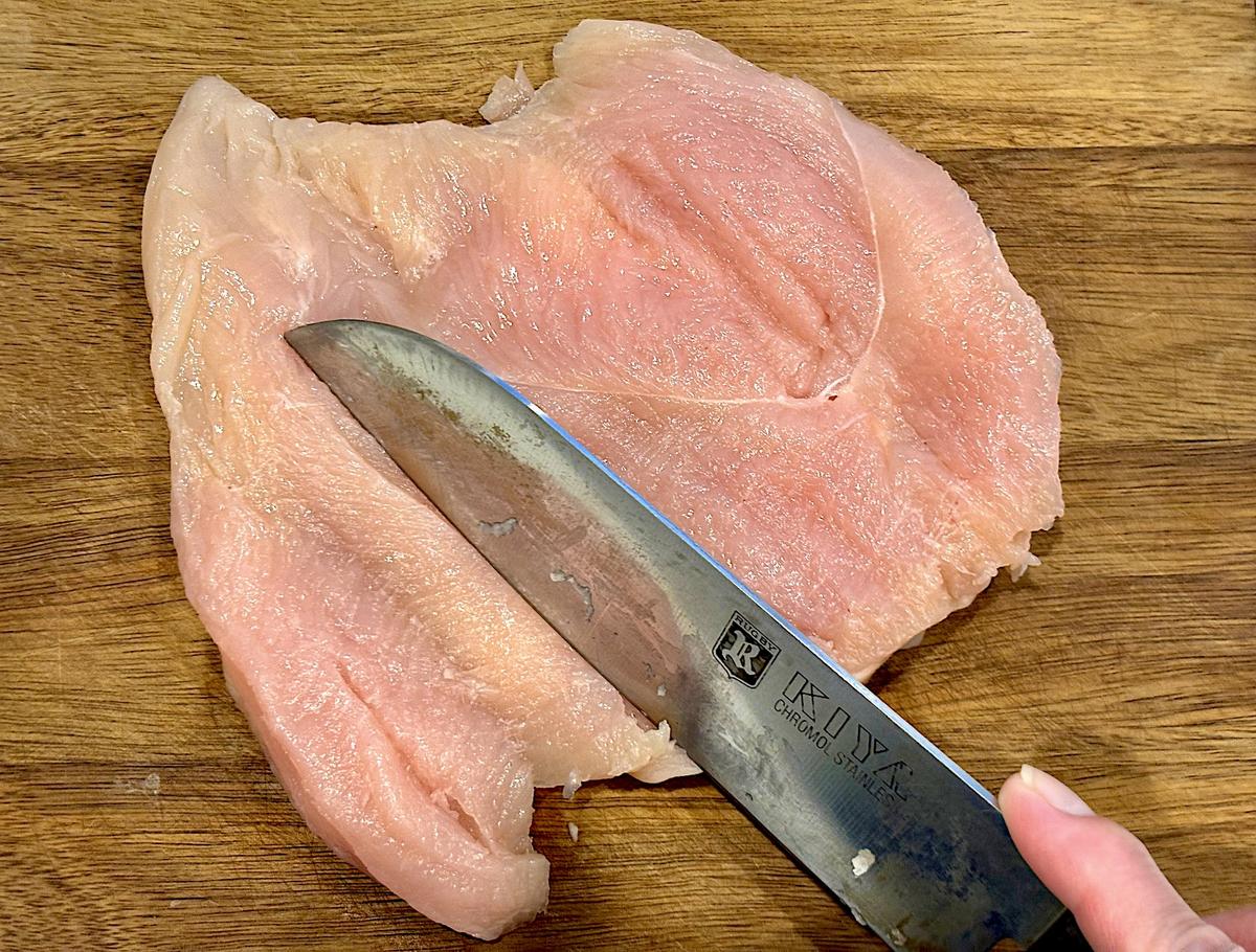 1. 鶏むね肉の中央に厚みの半分くらいまで切り込みを入れて、その切り込みから左右へ横方向に包丁を入れて肉を広げる(観音開き)。