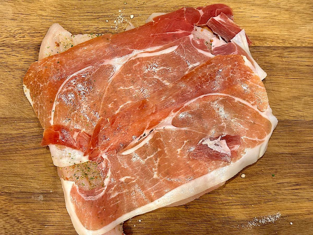 3. 生ハムをのせて、巻きやすい方向からきゅっときつめに巻く。