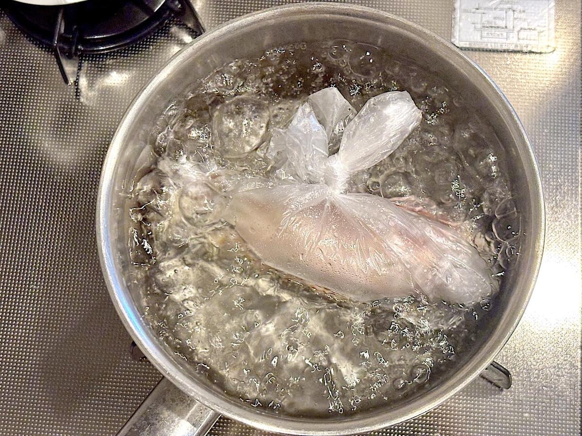 6. 耐熱のポリ袋に入れ、できるだけ空気を抜いて口をしばる。蓋つきの鍋に湯を沸かし、3を入れる。再び沸騰して1分ほどキープしたら火をとめ、蓋をしてそのまま1時間ほど保温する。