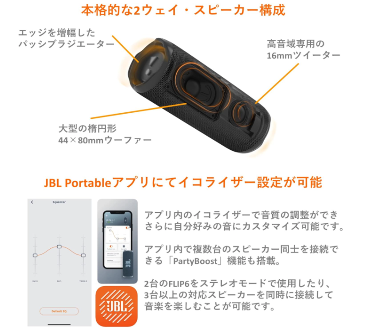 「FLIP6」は、「FLIP」シリーズのために開発された44x80mm径の大きな楕円形のウーファーと低音増強用に搭載されたデュアルパッシブラジエーターに加え、16mm径ツイーターを搭載し、クリアな高音域と深みのある重低音を実現。なんと49%オフで過去最安値の9,060円にて販売中です。