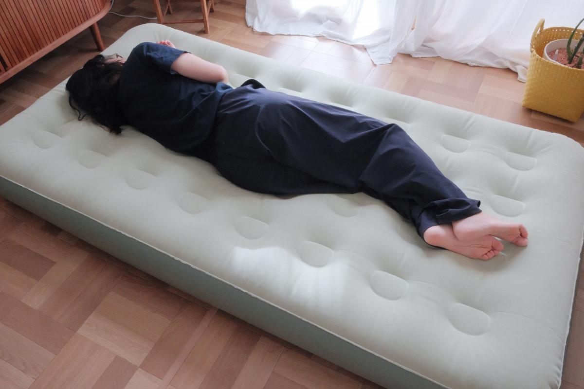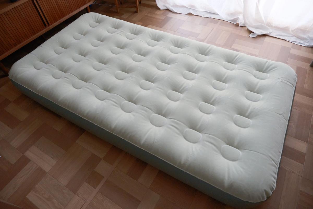 また、膨らませた状態のエアーベッドは相当軽いため、ベッドに腰掛けたり横になったりするときは、本体が動きやすいです。勢いよく乗ってしまうと、エアーベッドが移動して、窓や壁に激突してしまいそうだったため注意したいと思います。