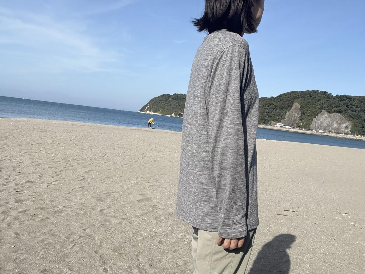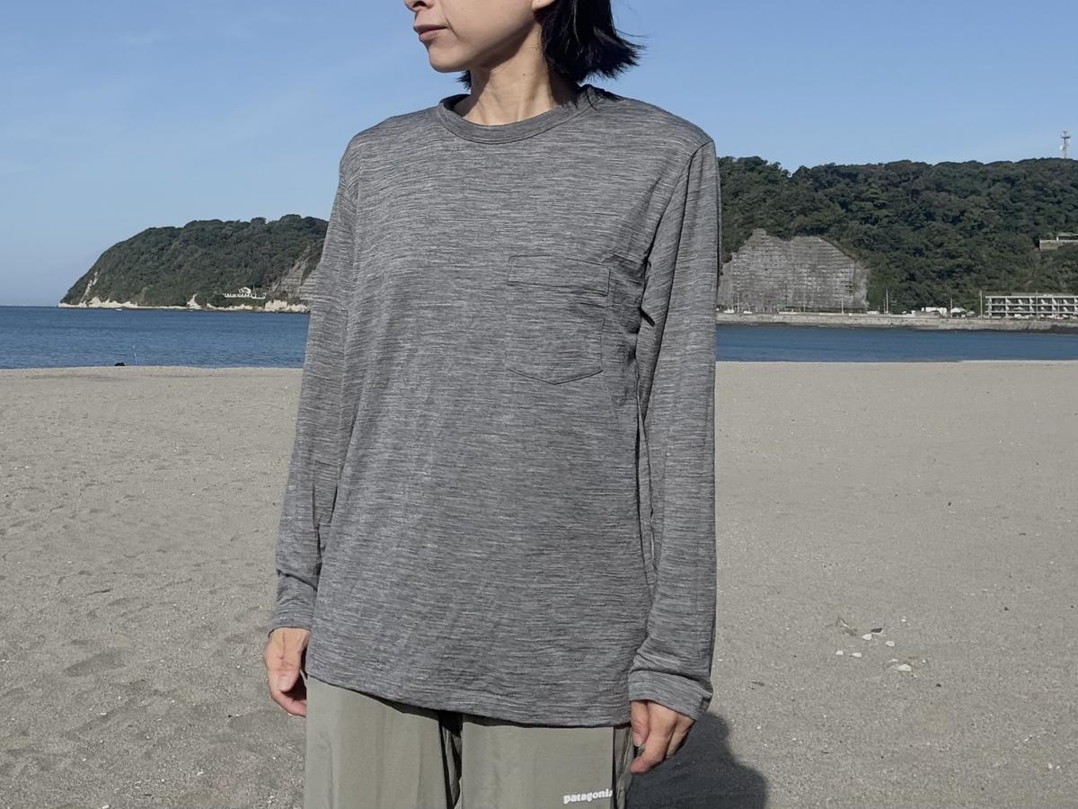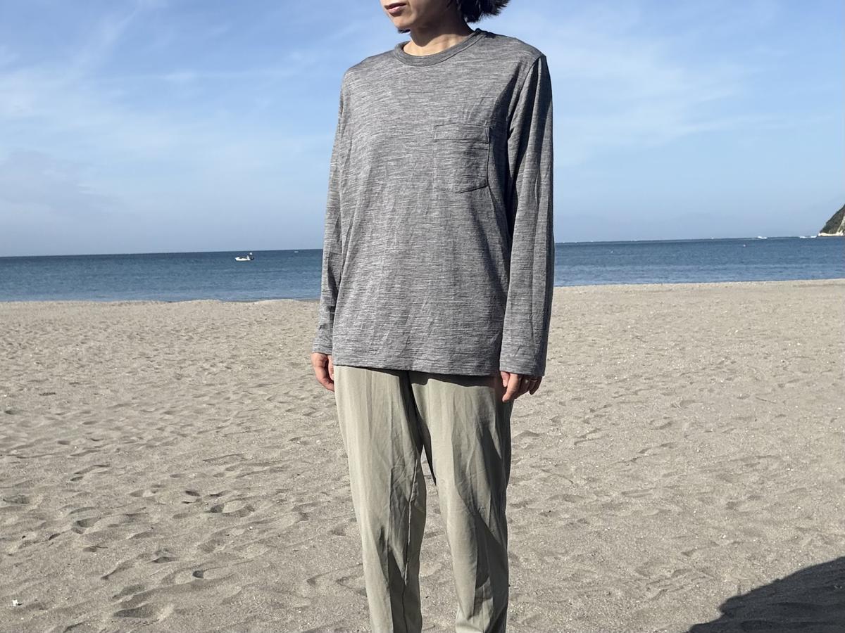 肌寒いこともある朝晩、同じくらいの薄さのコットンのロンTを着ていたらスースーする感じがしますが、メリノウールを着ていると「寒っ」となりません。