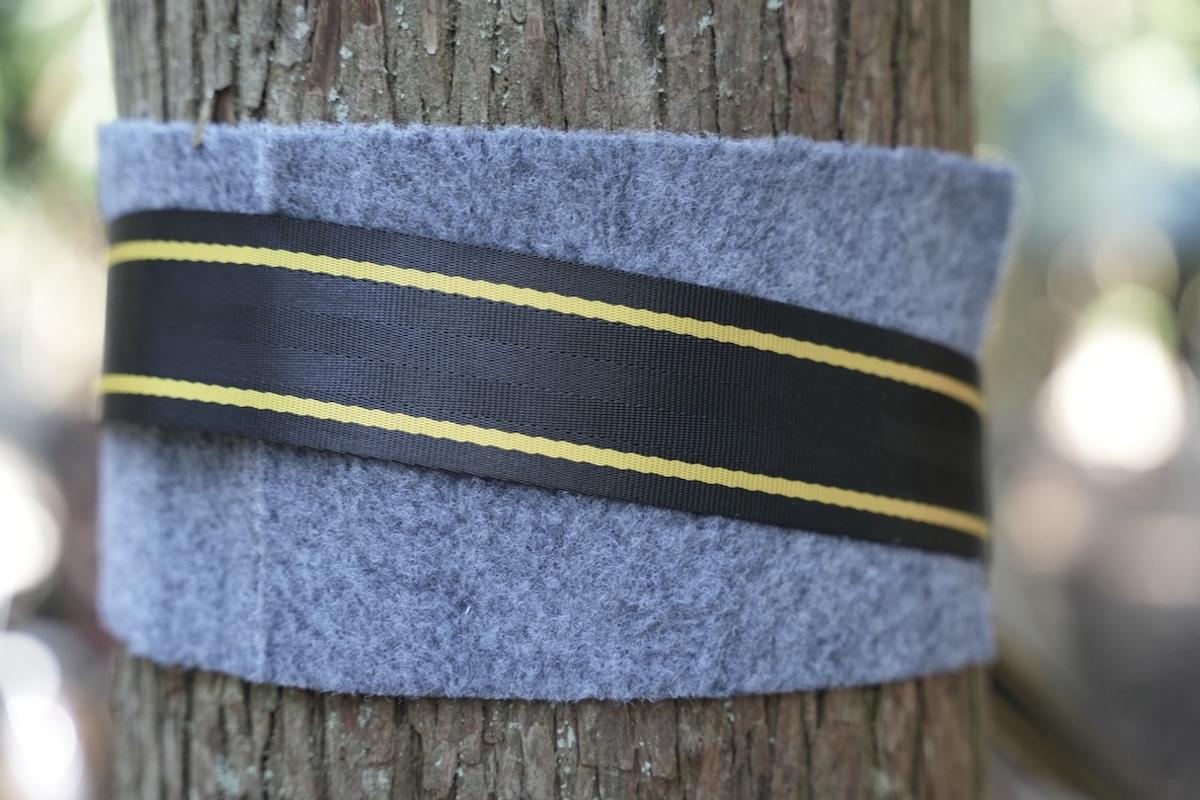 次に、木が傷まないようにフェルトなどで養生し、そこにロープやベルトを巻いていきます。