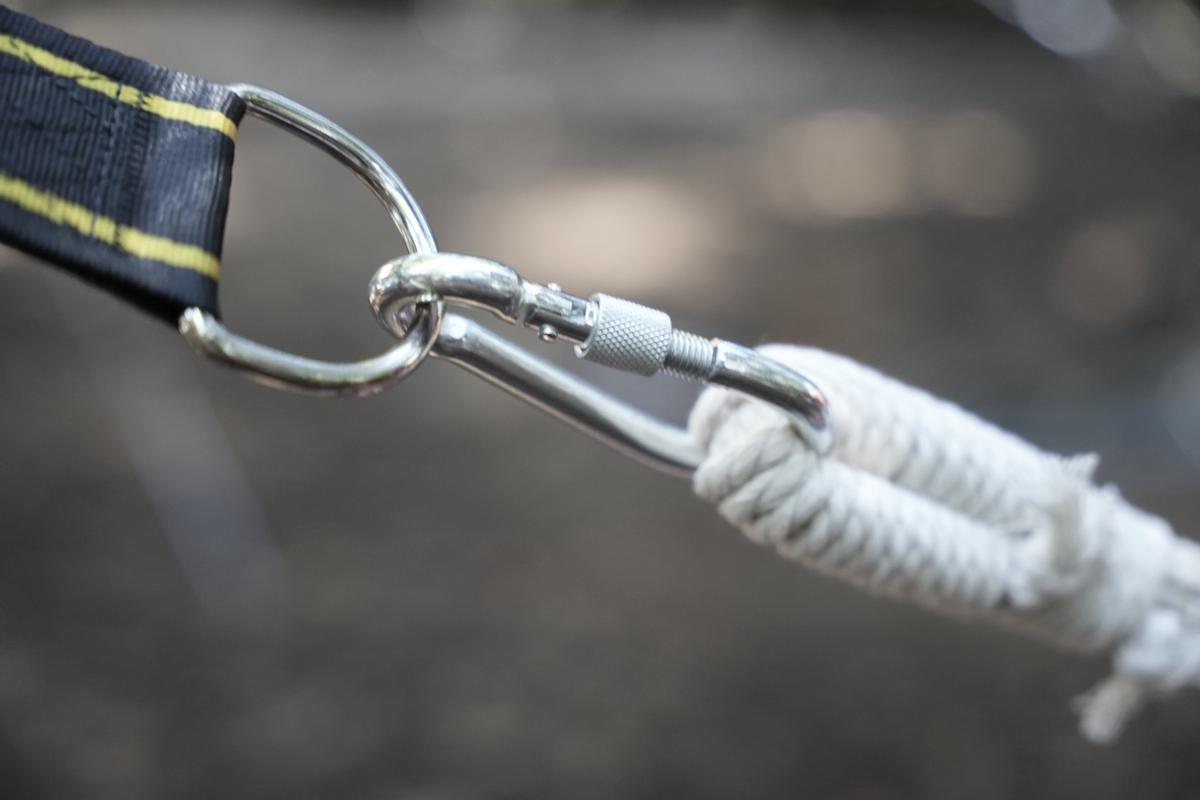 カラビナはなくても設置することはできますが、毎回ロープを結ぶのはちょっと面倒なので、手間を省くためにもカラビナを使うのはオススメです。